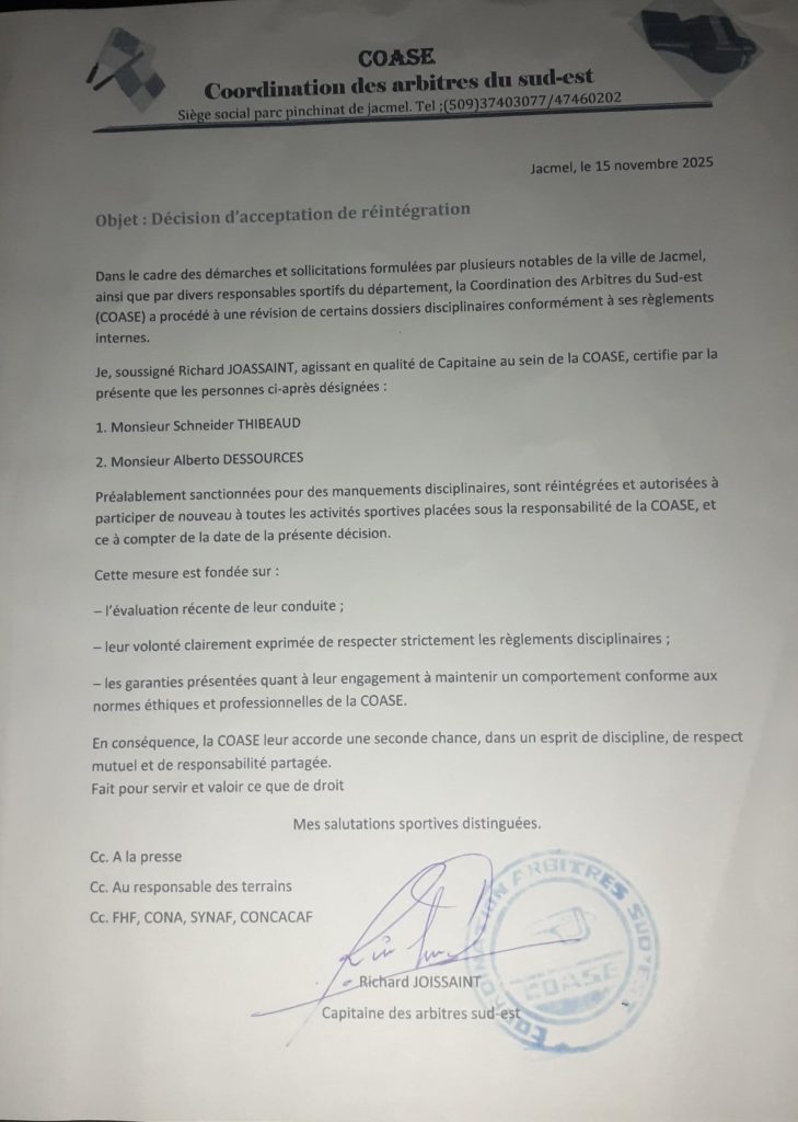 Après plusieurs mois de suspension, Schnaïder Thibaud, dit Ti Carlos, est habilité à fouler de nouveau les terrains de football suite à une décision d’acceptation de réintégration de la Coordination des arbitres du sud-est (COASE), certifiée par le capitaine Richard Joissaint, en date du 15 novembre 2025.